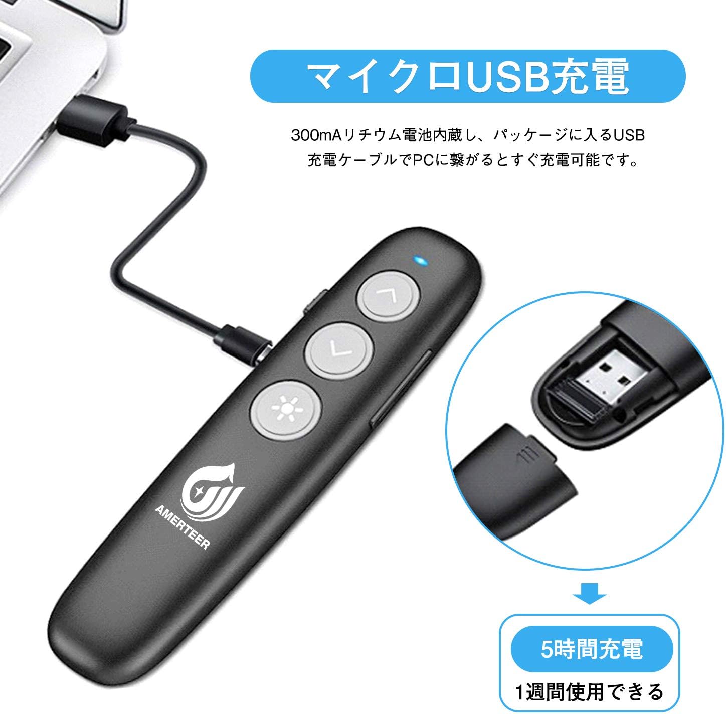 ● 【USB充電式】電池交換不要の充電式、(3.7V/360mAh)リチウム電池内蔵で、乾電池の入れ替えは不要、便利で環境にも優しい。USB充電式なので、プレゼンする前にパソコンに差しておけば大丈夫。ただ約30gなので超軽量ですが、握ると実感があります。