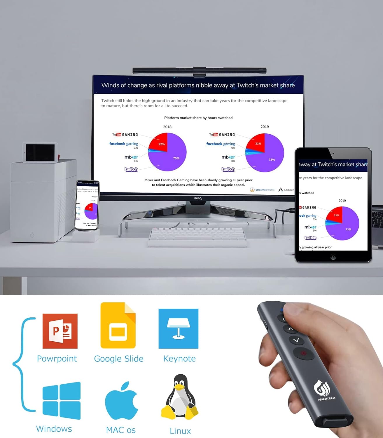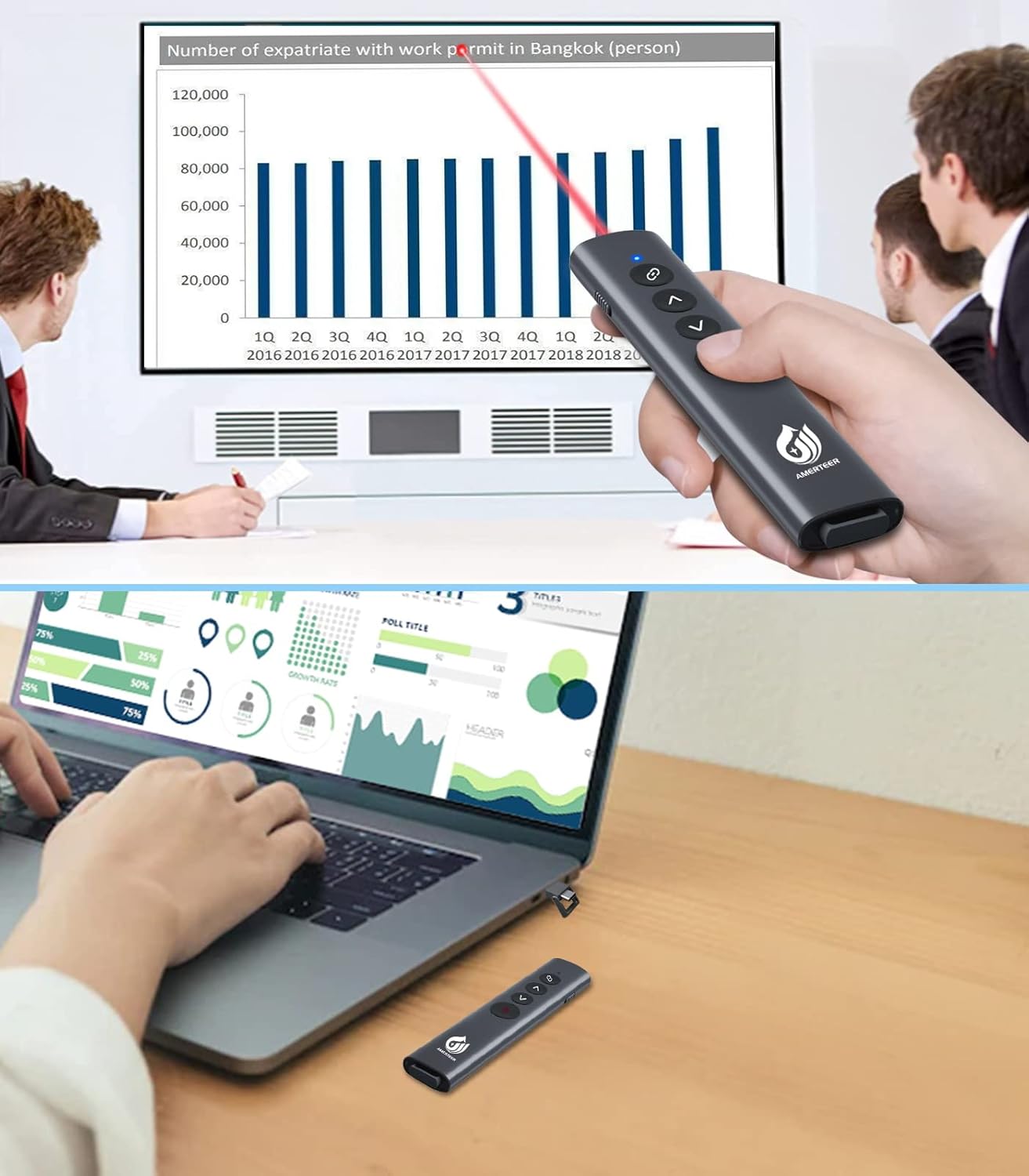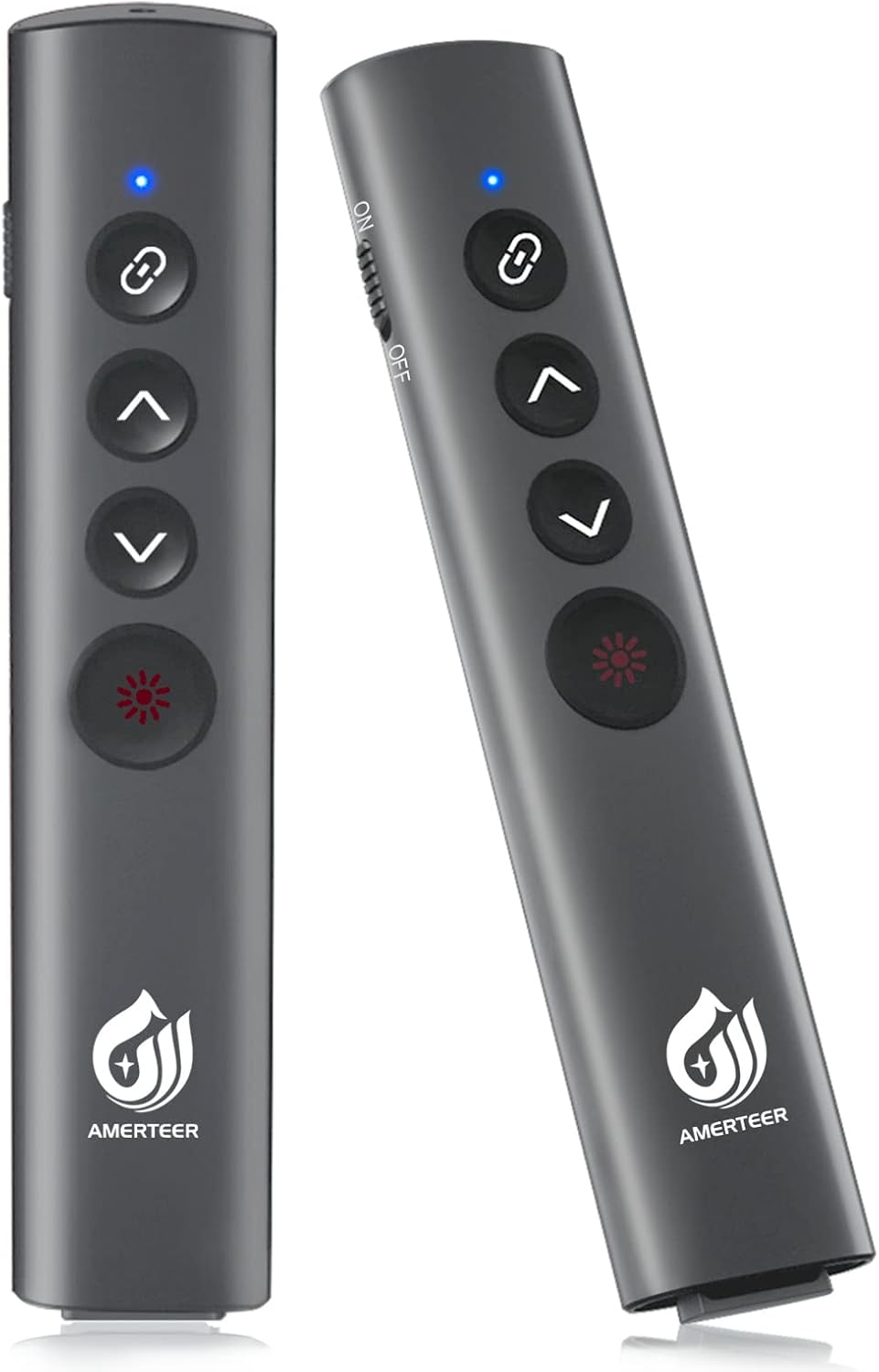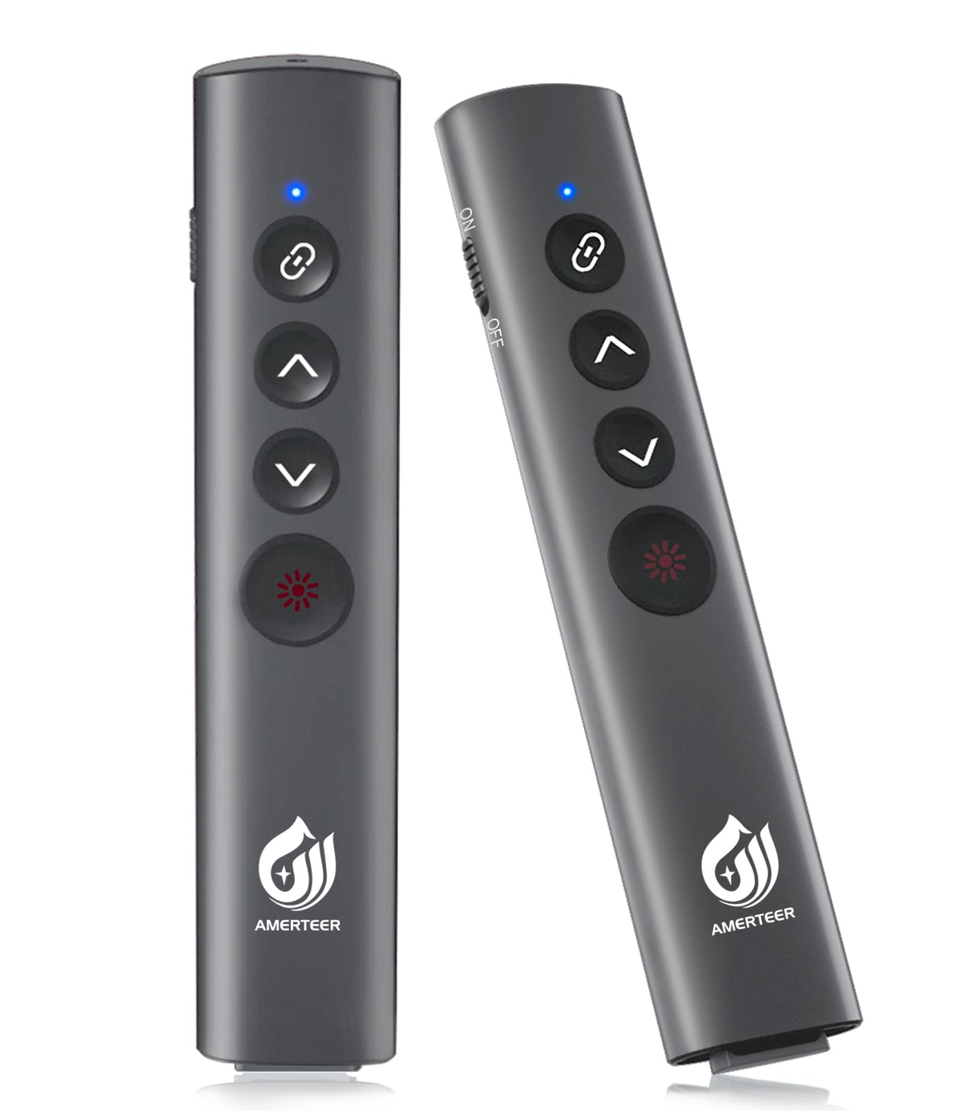 AMERTEER レーザーポインター PPTスライド用リモート ワイヤレス プレゼンター USB充電式 リモートコントロール PSC認証済み ハイパーリンク操作 PowerPoint、Keynote、Googleスライド用リモート等対応 収納パック付き グレー (075)