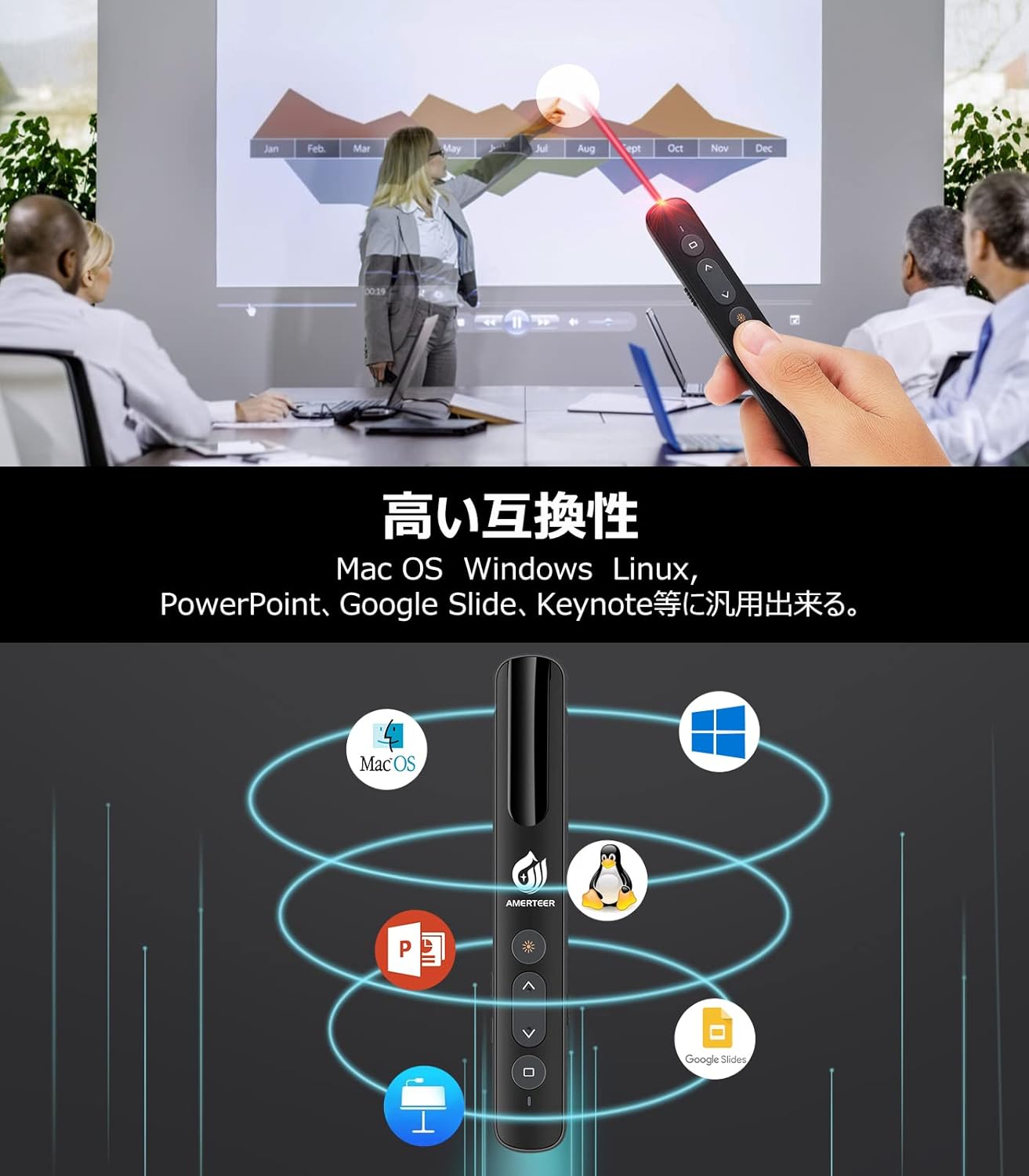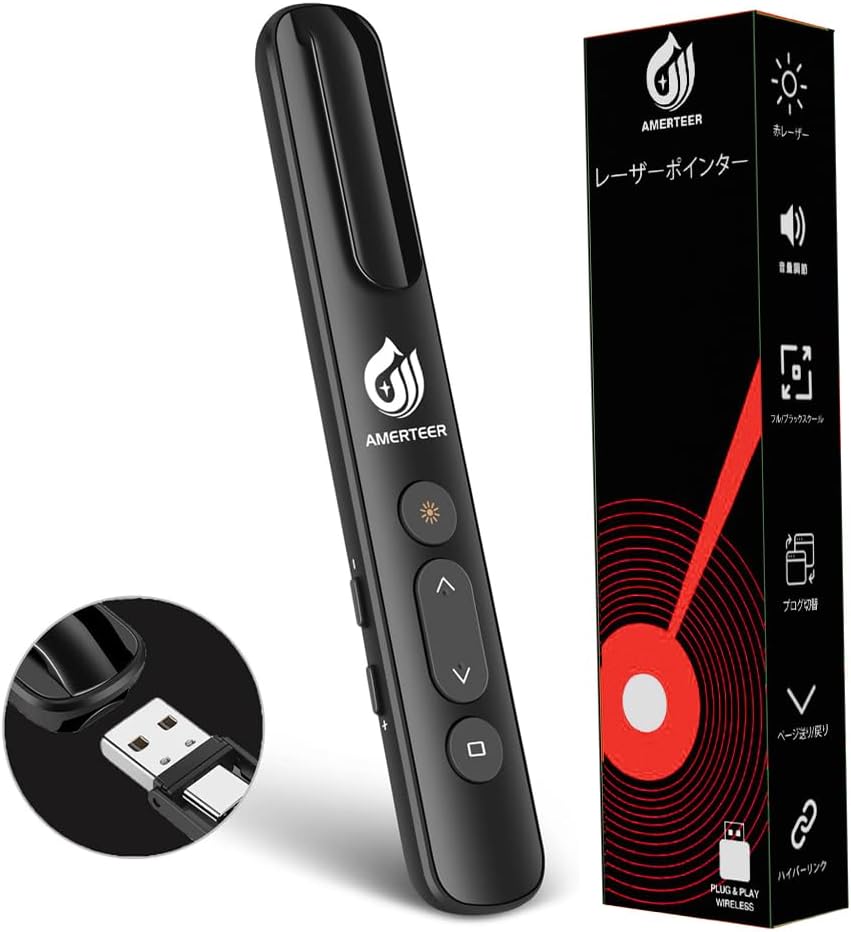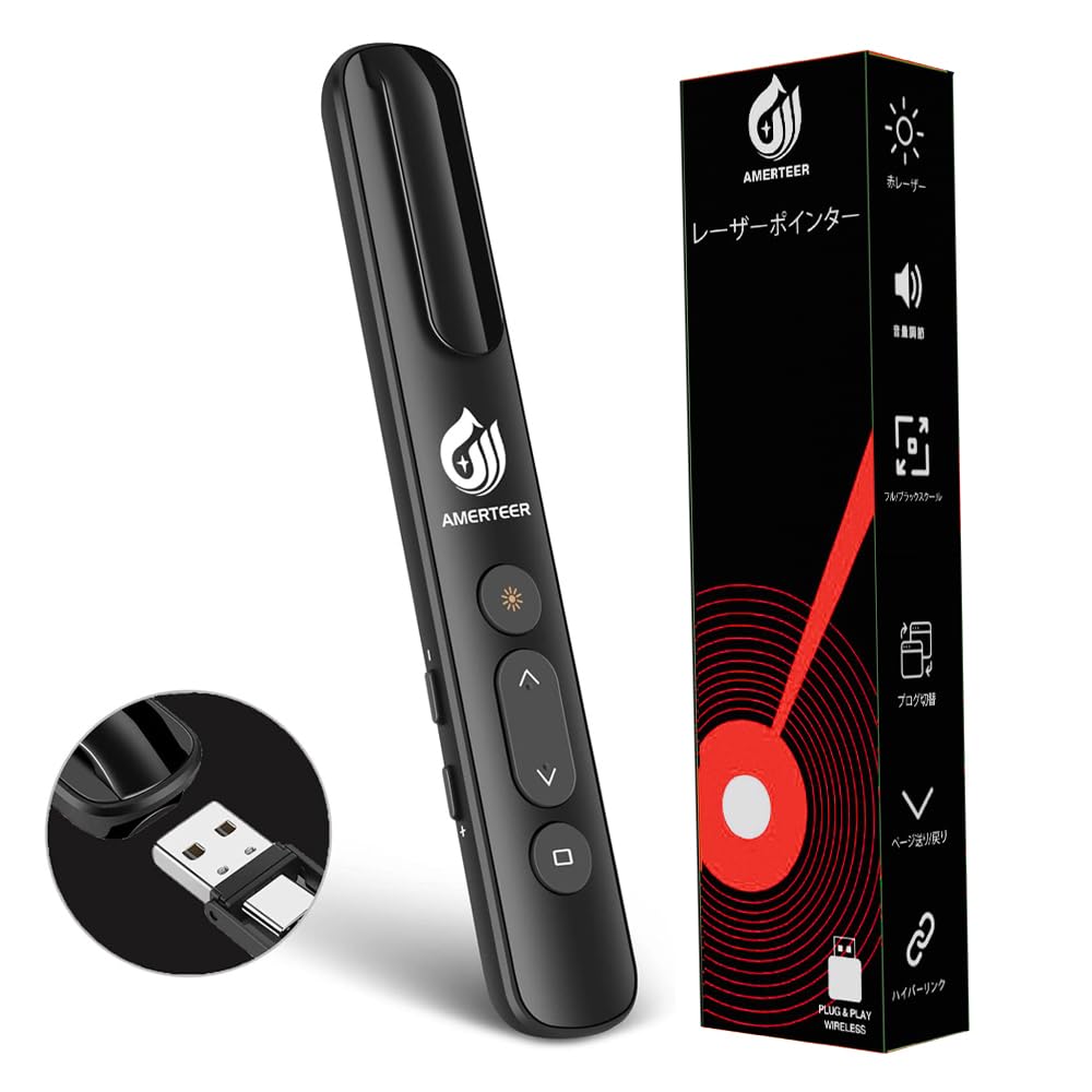 AMERTEER レーザーポインター PPTスライド用リモート ワイヤレス プレゼンター USB充電式 リモートコントロール PSC認証済み ハイパーリンク操作 PowerPoint、Keynote、Googleスライド用リモート等対応 収納パック付き ブラック (072)