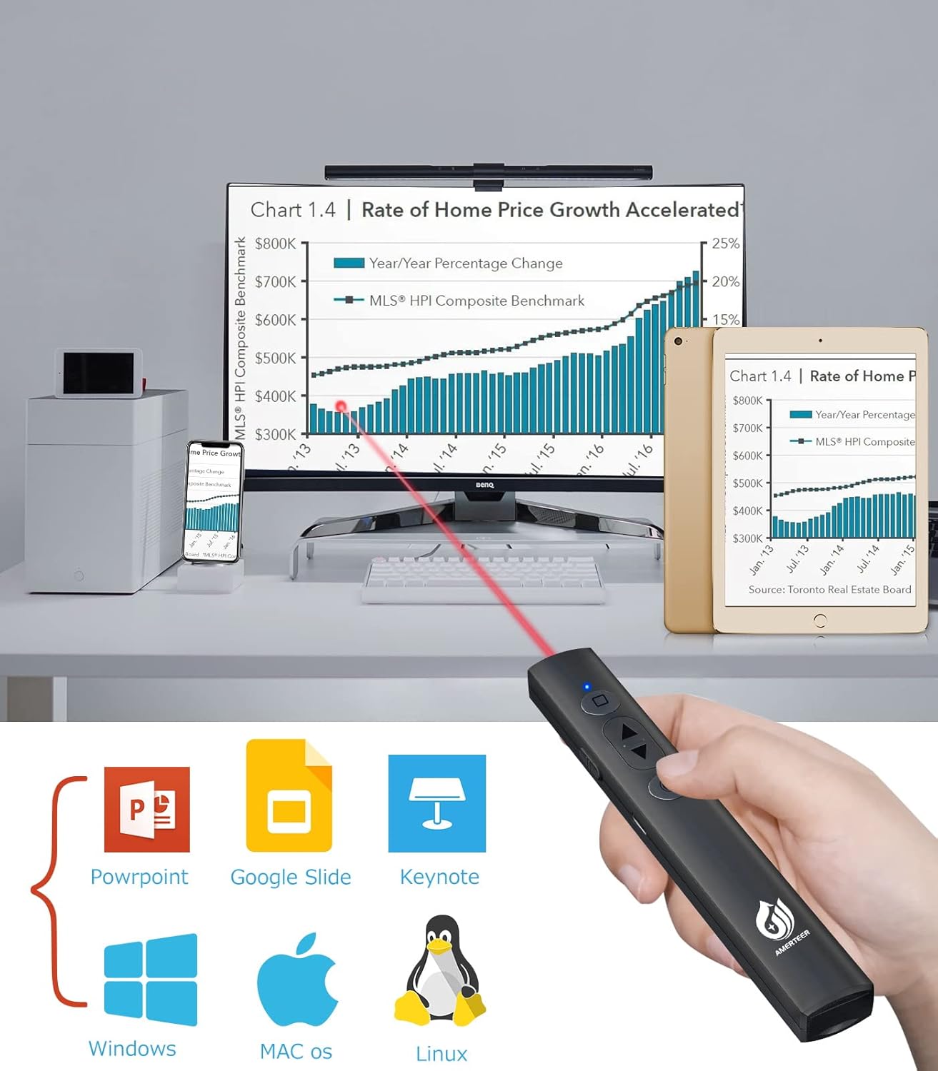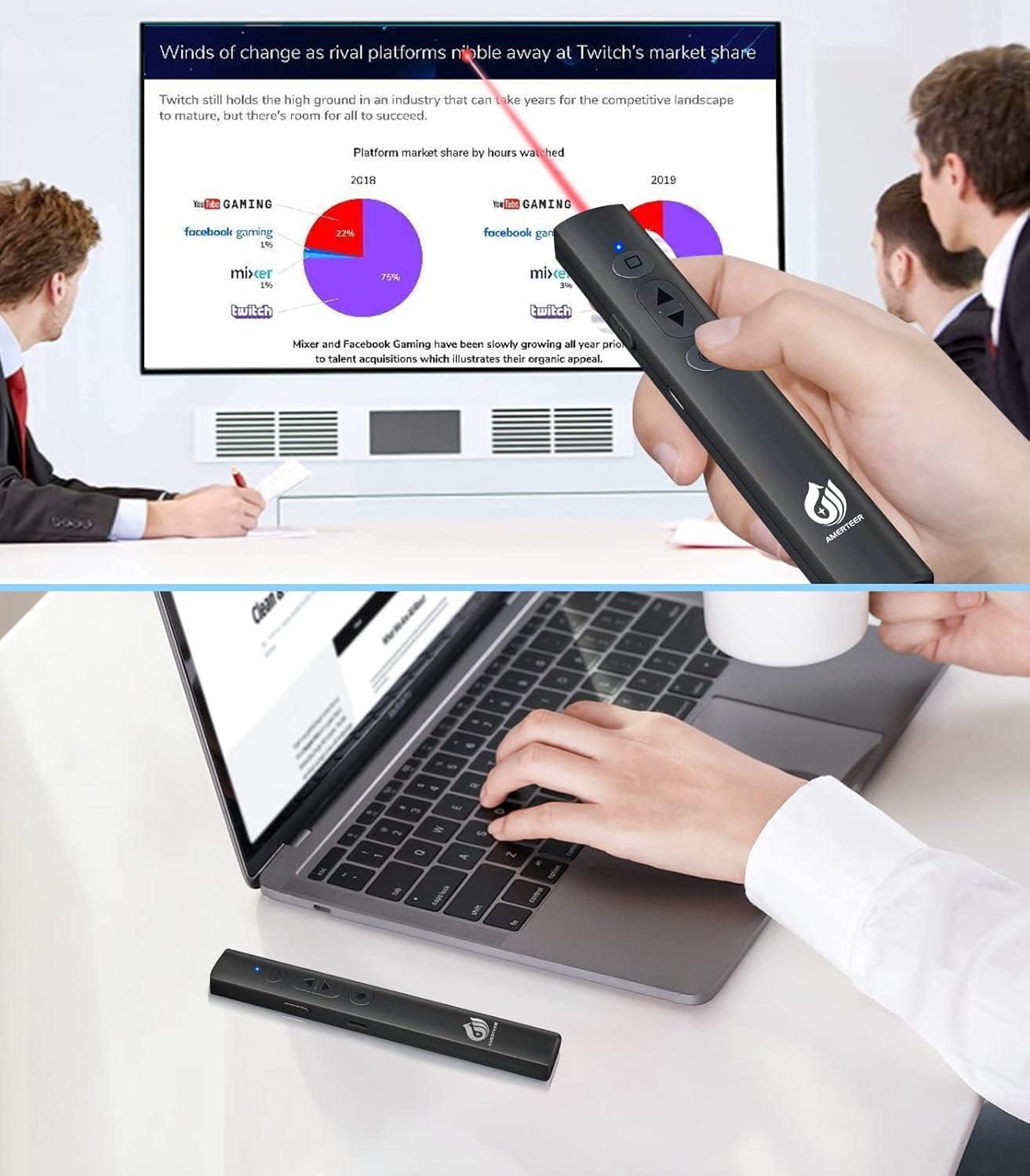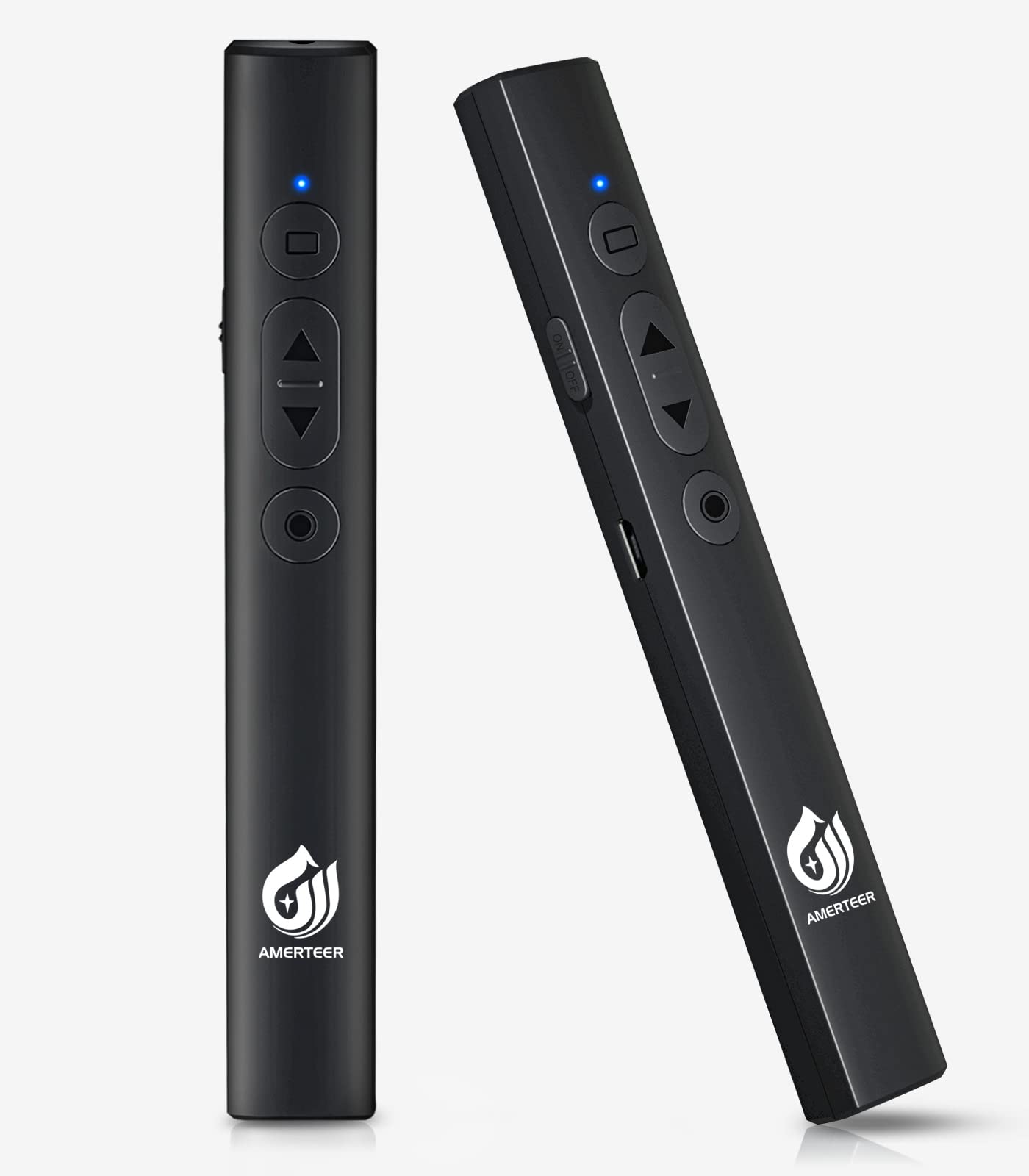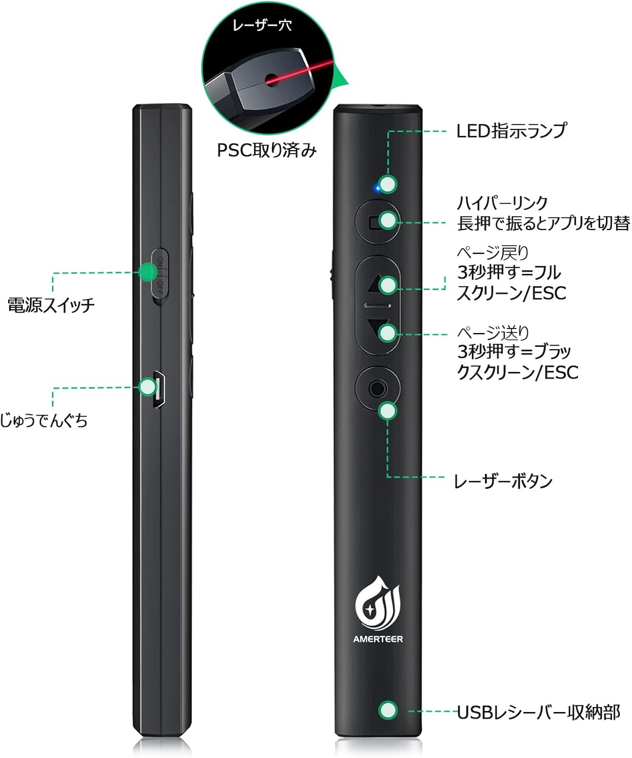 AMERTEER レーザーポインター PPTスライド用リモート ワイヤレス プレゼンター USB充電式 リモートコントロール PSC認証済み ハイパーリンク操作 PowerPoint、Keynote、Googleスライド用リモート等対応 収納パック付き ブラック (073)