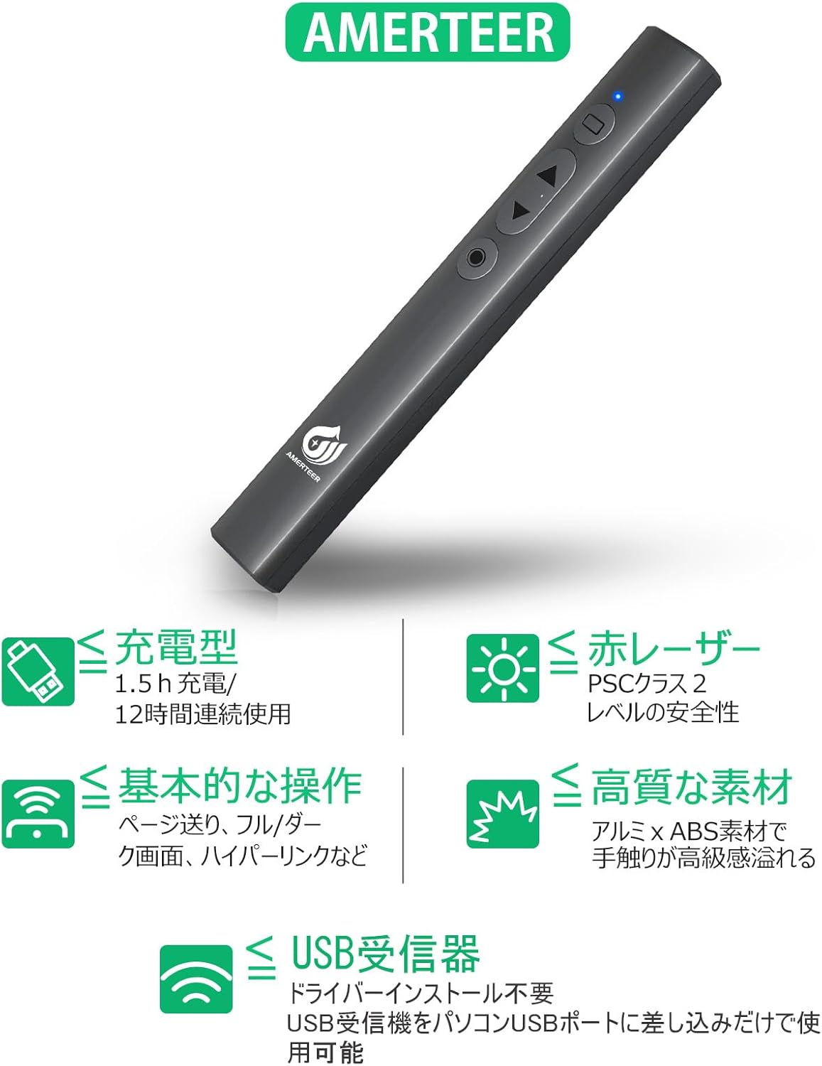 ● 【USB充電式】電池交換不要の充電式、(3.7V/360mAh)リチウム電池内蔵で、乾電池の入れ替えは不要、便利で環境にも優しい。USB充電式なので、プレゼンする前にパソコンに差しておけば大丈夫。ただ約30gなので超軽量ですが、握ると実感があります。